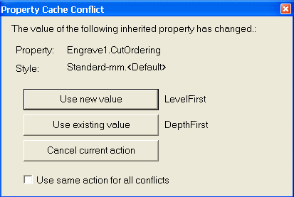 If the result of a Default property has changed from the previous value used, a Property Cache Conflict message may be shown. This may occur if the value stored in the parent style has changed, or if the style uses an Auto value and parameters that affect the result of the automatic calculation have changed.