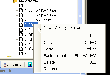 The context menu shown when right clicking a style also contains a New CAM style variant option. This will create a new style that inherits its default parameters from the selected ‘parent’ style.