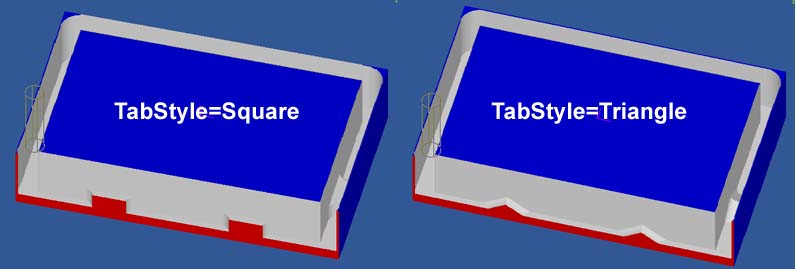 There are two types of holding tab cross-section shapes available which is defined in the Tab Style property: Square and Triangle. Triangles are a good all-round tab shape, easy to clean up and provide a degree of ramping back down into the stock. Squares can be stronger and can also be used with lead in moves when Use Lead Ins is set true. This is useful for holding tabs in harder materials.
