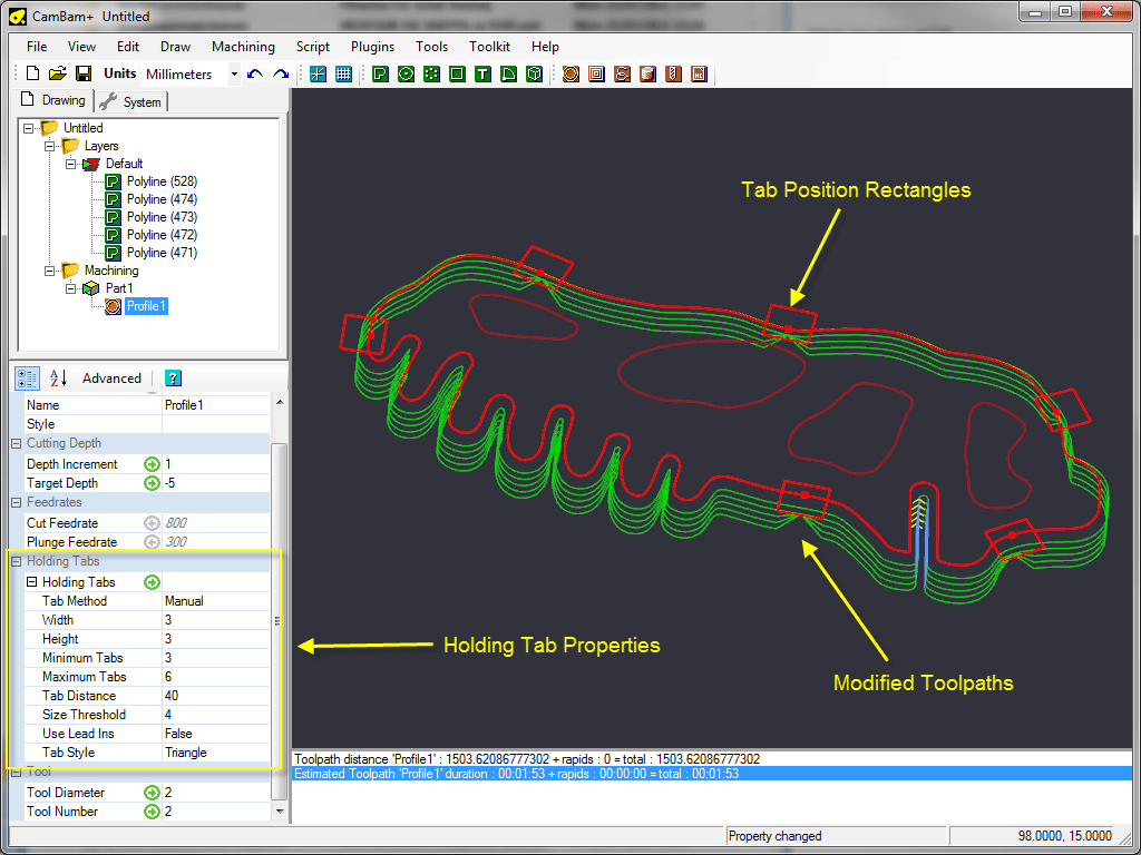 The size of the holding tabs is controlled by the Height and Width holding tab properties. Height is taken to be as measured from the target depth of the profile, to the top of the desired holding tab. The width will be the width as measured at the thinnest part of the holding tab. The rectangles used to display tabs and the resulting gaps in the toolpaths will appear wider than this width setting. This is to compensate for the tool diameter.
