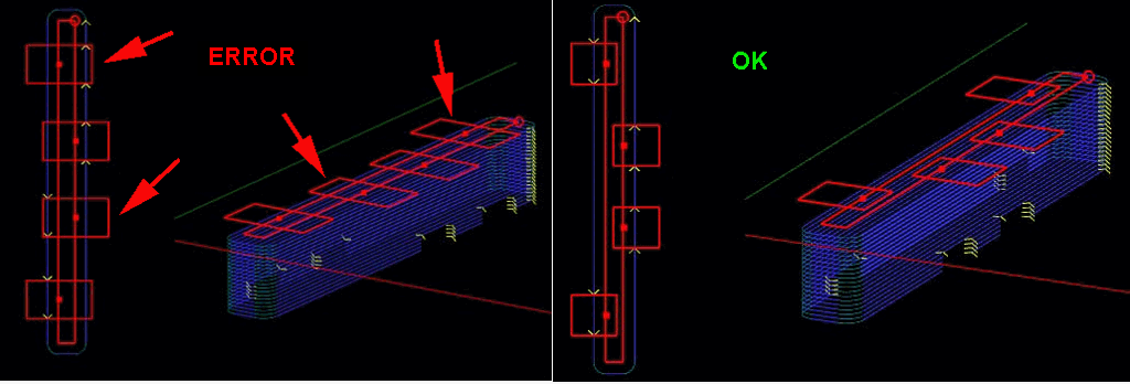 In some cases, such as very narrow source shapes, a problem can occur where the shape of the holding tab may extend to the toolpath on the other side of the part and holding tabs incorrectly assigned to the wrong side.
