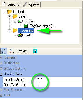 To help resolve this problem, two parameters are available in the Machining properties of the drawing: Inner Tab Scale and Outer Tab Scale. These are used to extend or contract the size of the tab ‘rectangle’. The inner tab scale will alter the size of the tab rectangle that extends towards the source shape. The outer tab scale will affect the tab size away from the stock shape.