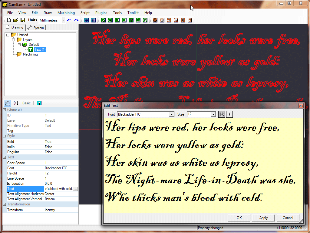 To create some engraving gcode, select the text then select the Machining - Engrave menu option or use the