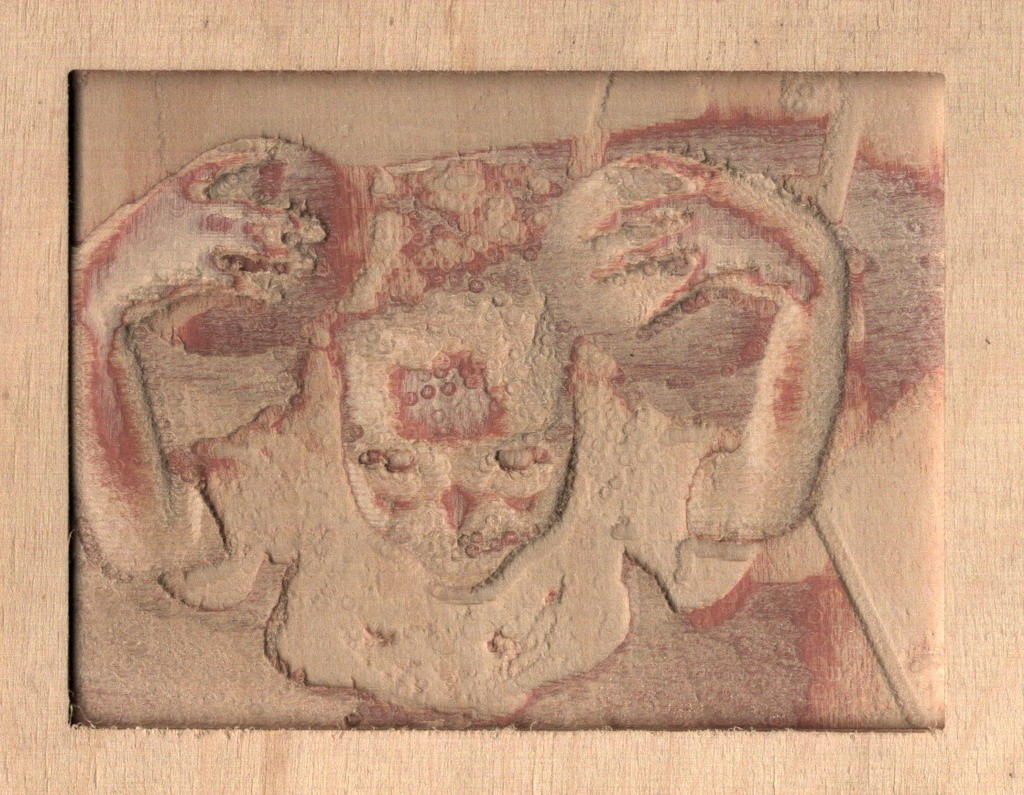 Here is the very first Heightmap I produced from CamBam. The image is 120mm X 90mm using a 2mm flat bit in plywood. Not fantastic to look at but at least there were no disasters.