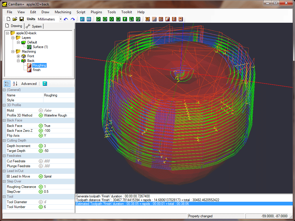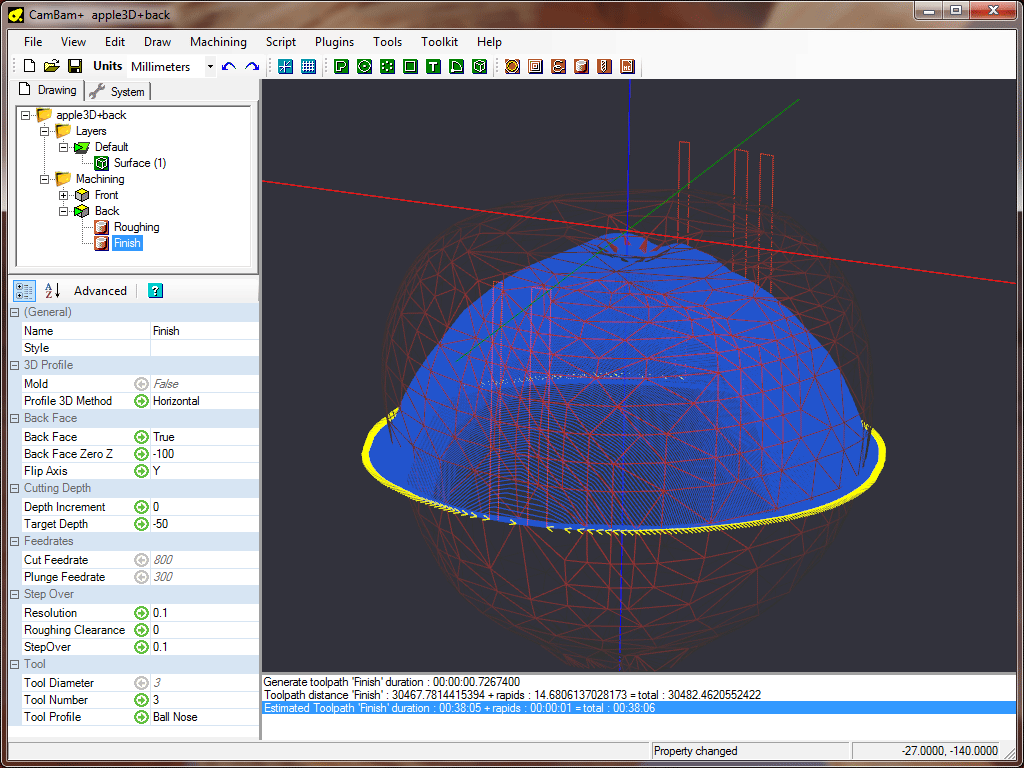 The back face toolpaths will be displayed in the orientation they will be machined, which may overlay the top face of the surface. Hiding the drawing layer containing the 3D surface, or setting wireframe view mode makes viewing the toolpaths easier.