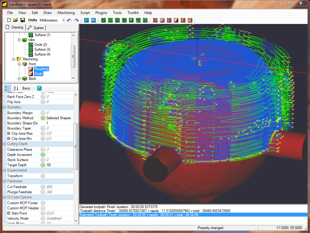 To prevent the machining operation machining around the ends of the cylinders, we need to reduce the boundary shape. This is achieved by specifying Selected Shapes in the Boundary Method property and selecting only the main surface object, excluding any holding tab cylinders.