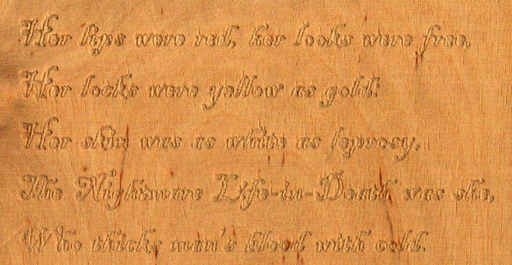 Not exactly high art, but the letters are quite small (3-6mm) and plywood isn't the best precision engraving material.